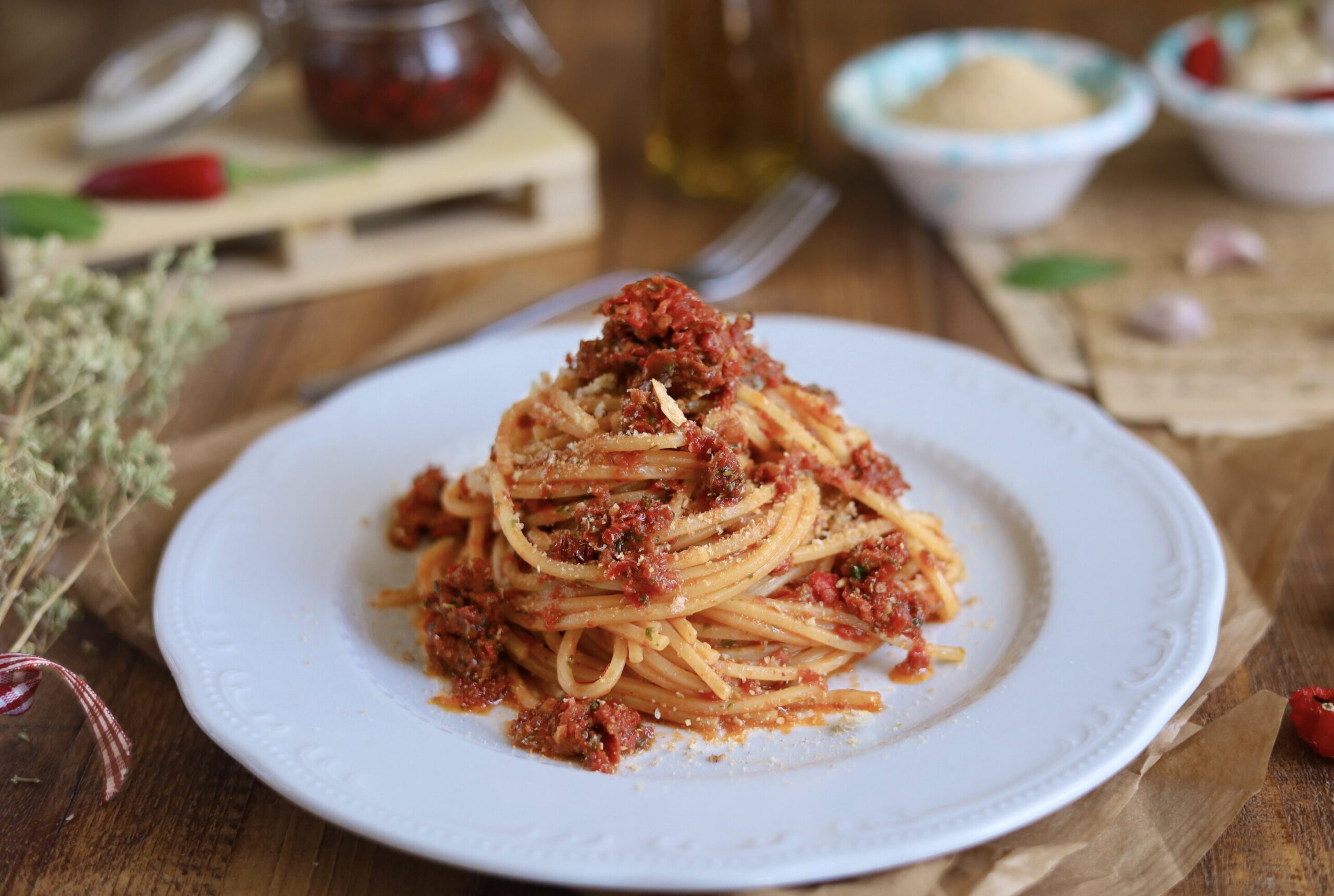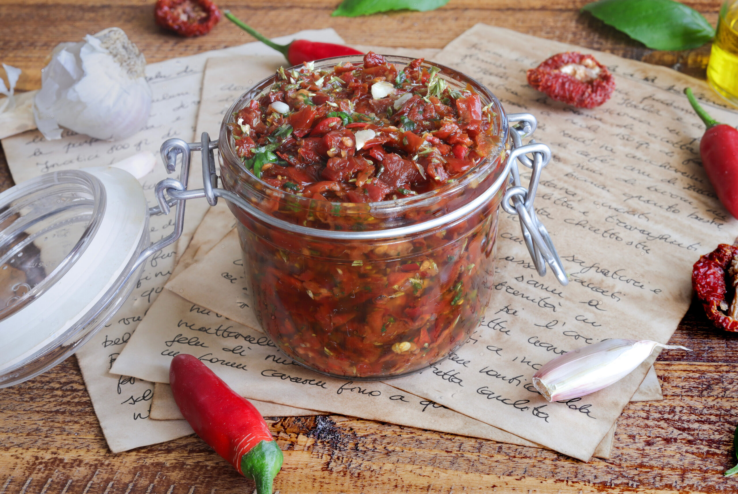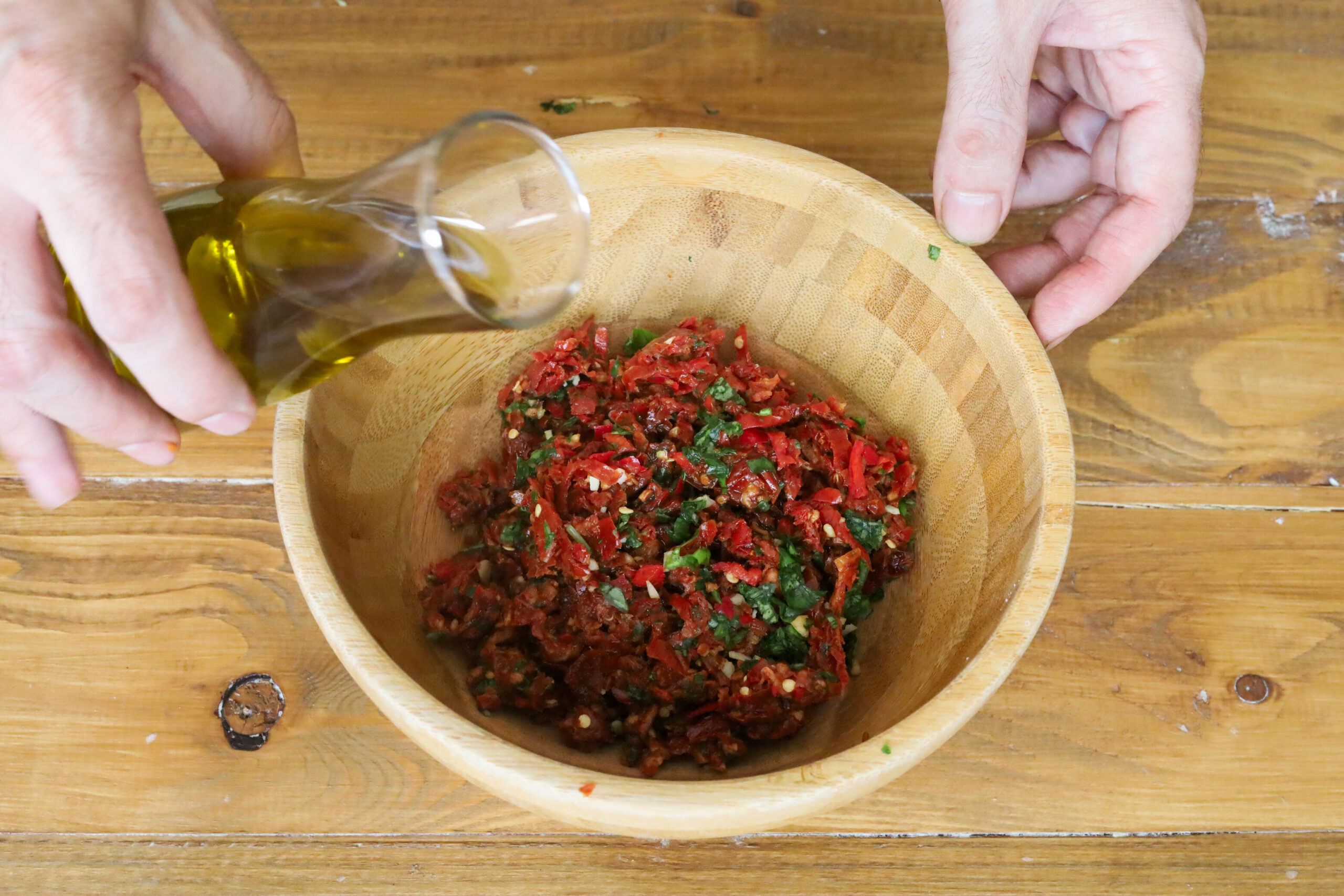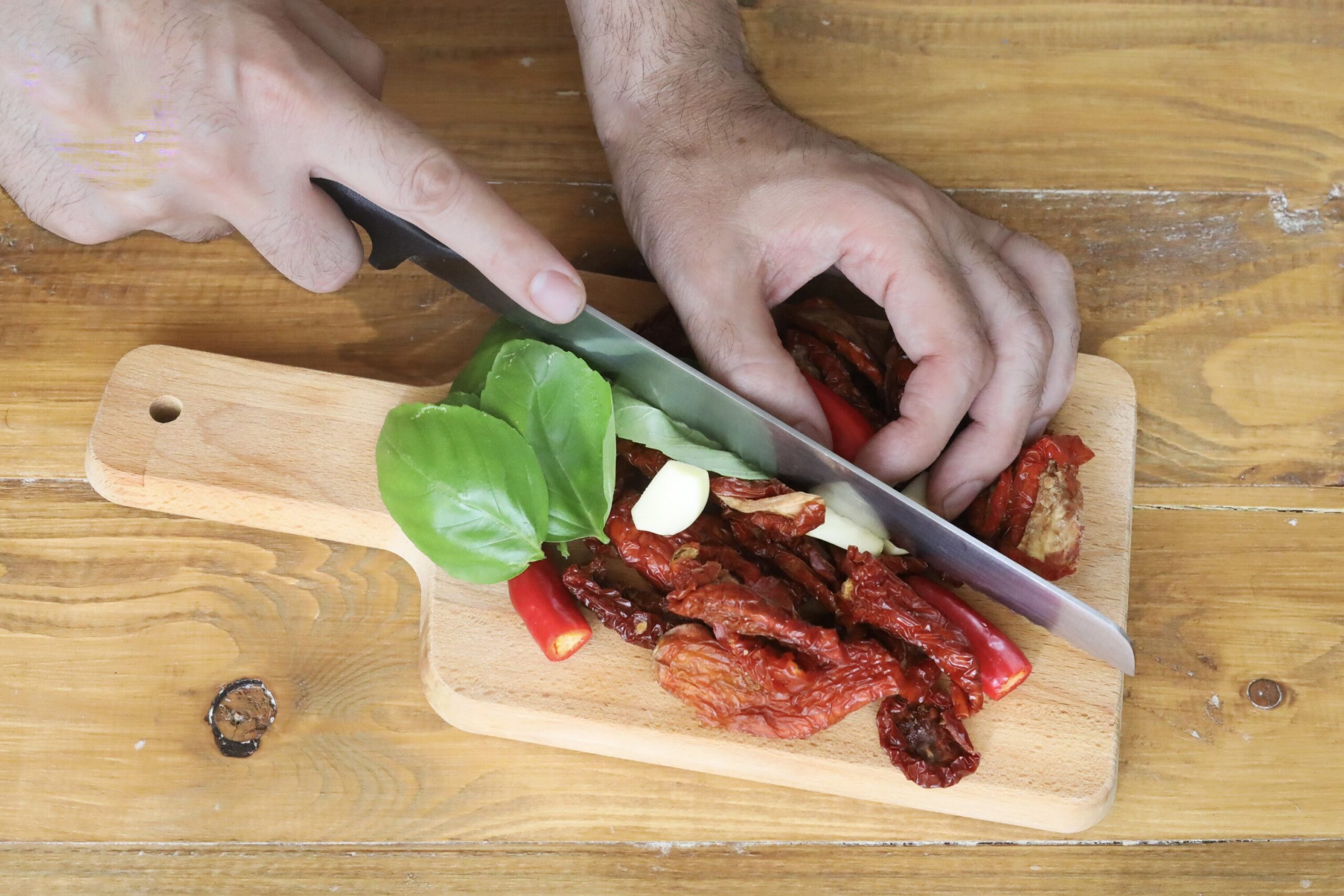 In un tagliere riuniamo i pomodori secchi, l’aglio, il peperoncino, il basilico e sminuzziamoli con un coltello. In alternativa utilizziamo un robot da cucina facendo attenzione a non macinarli troppo. Aggiungiamo una manciata generosa di origano, disponiamo dentro ad un contenitore e aggiungiamo abbondante olio extravergine d’oliva. Mescoliamo, versiamo in un barattolo e lasciamo riposare per un paio d’ore coprendo con un coperchio.